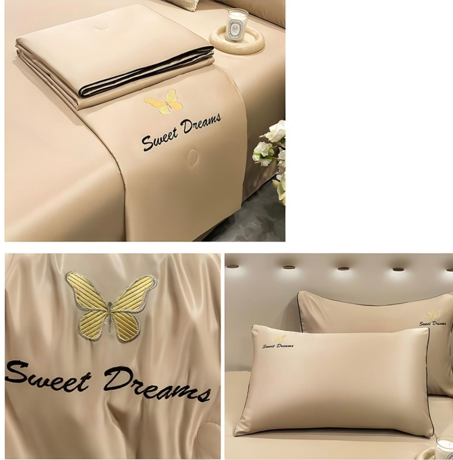 Комплектът включва 4 части – долен чаршаф, олекотена завивка и две калъфки, осигурявайки пълно оформление на леглото. Бежовата цветова гама придава усещане за топлина и уют в спалното помещение.