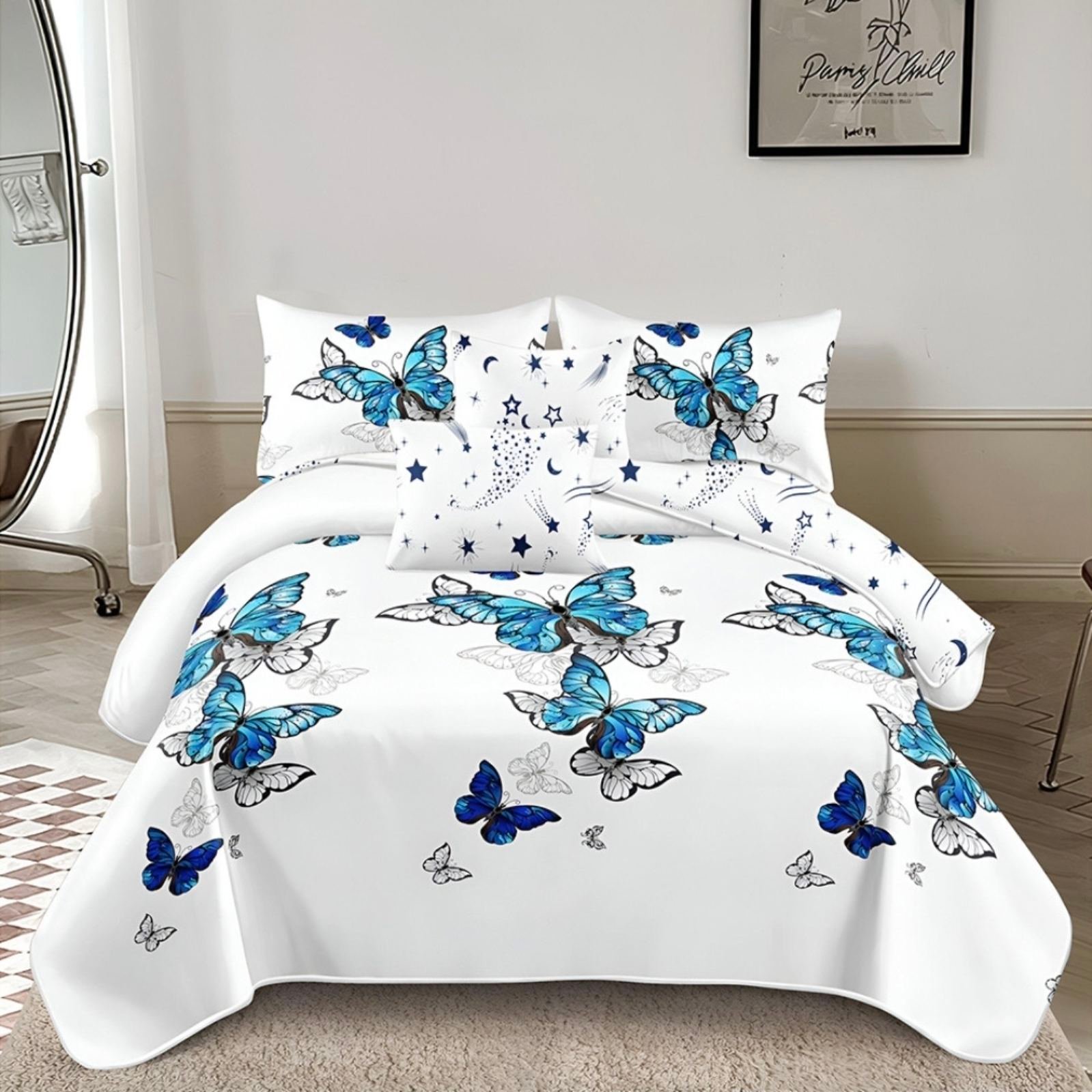 Спалният комплект СИНИ ПЕПЕРУДИ е стилно предложение за любителите на свежите и ефирни десени. Изпълнен в бяло-синя цветова гама, той създава усещане за чистота и спокойствие, а деликатният акцент от сини пеперуди придава чар и изисканост.