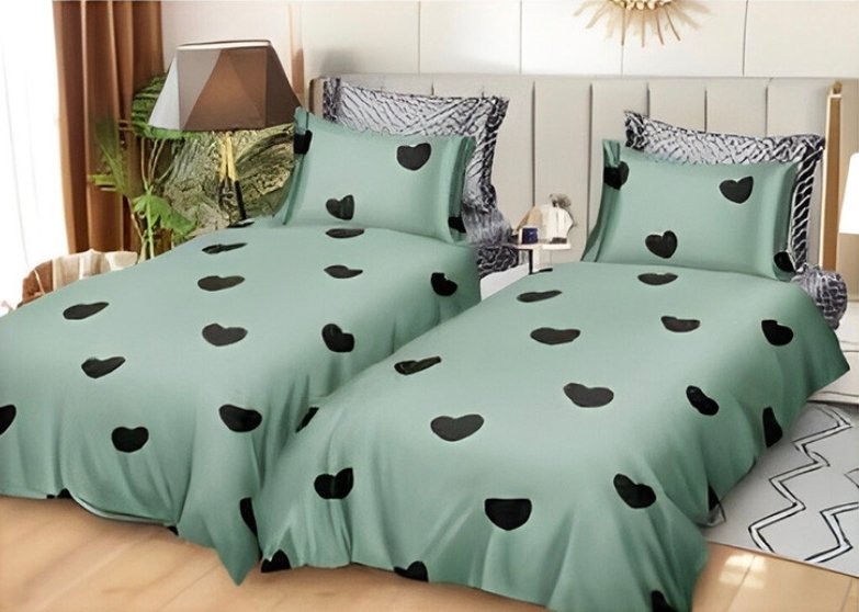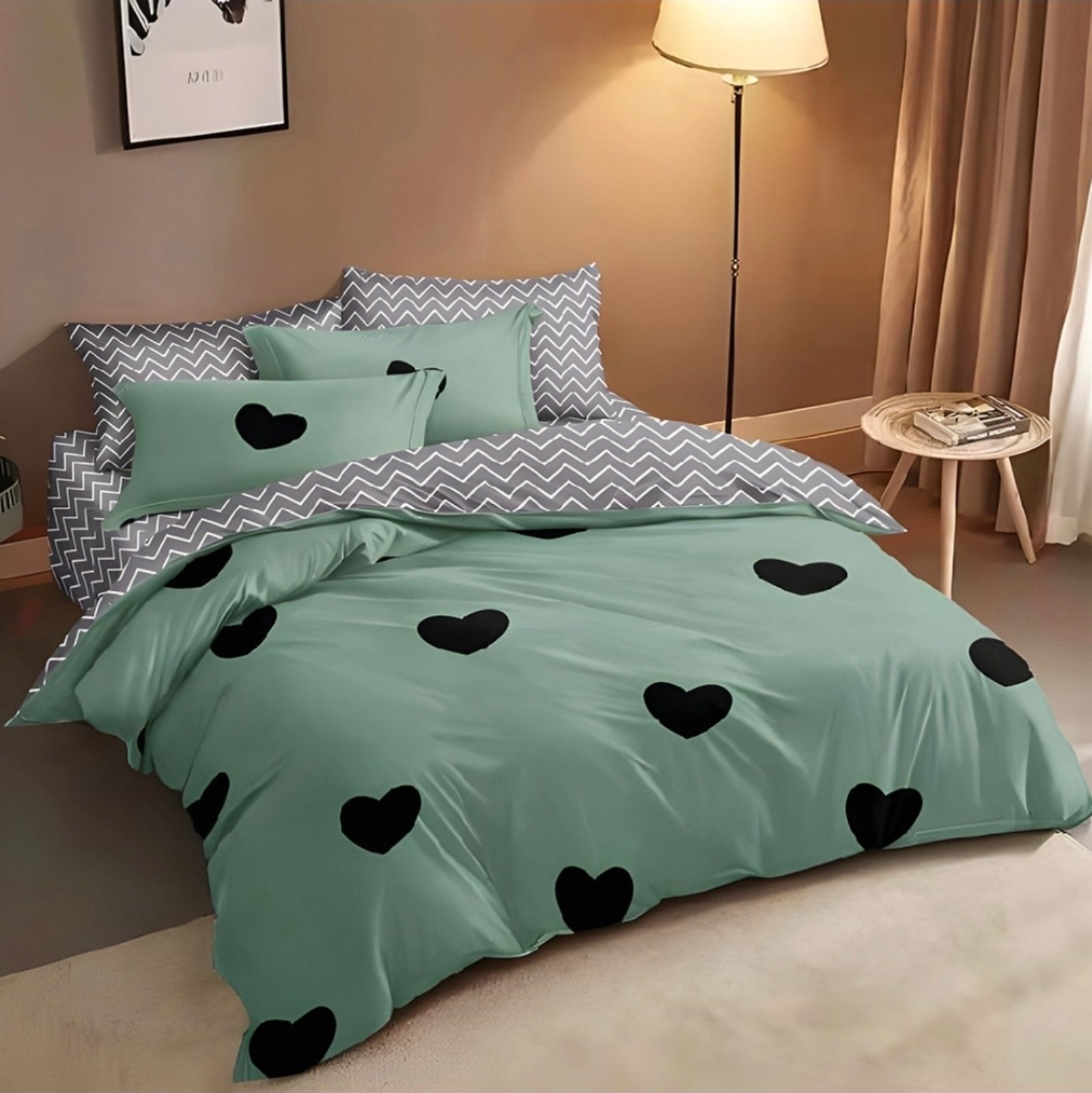 Елегантната комбинация от зелено и сиво внася хармония и спокойствие, а деликатният мотив със сърца придава романтичен акцент на спалнята. Комплектът съдържа 7 части – два горни плика, четири калъфки и голям долен чаршаф, осигурявайки пълна завършеност и практичност. Закопчаването с цип улеснява ежедневната употреба и поддръжка.