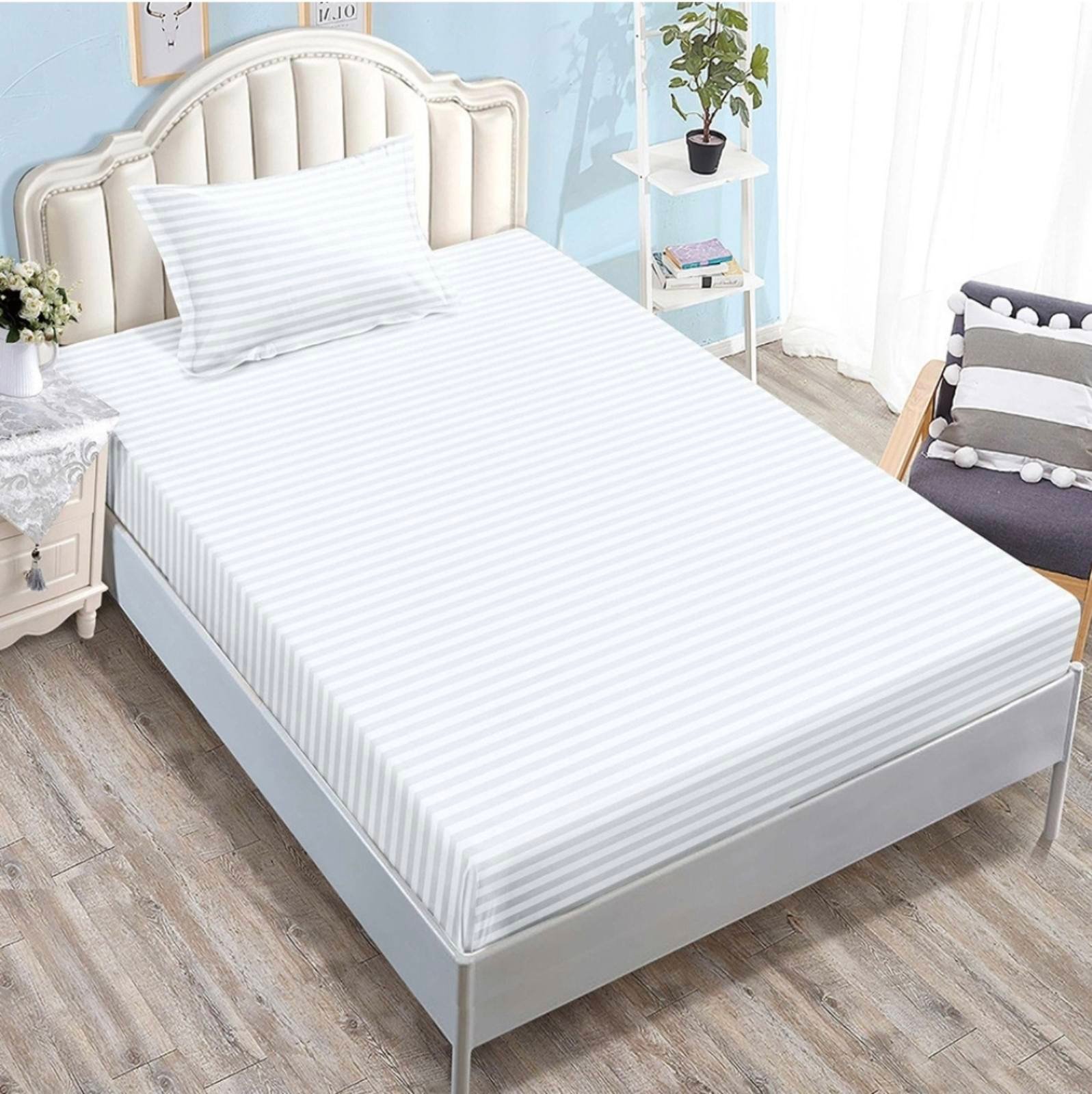 Този елегантен и удобен комплект включва чаршаф с ластик, който обгръща матрака плътно, и две стилна калъфка за възглавници. Създаден за единични легла с матрак от 80×200 до 90×200 см, комплектът е изработен от висококачествена материя – 90% памук и 10% сатен, осигуряваща мекота, здравина и лек сатениран отблясък.